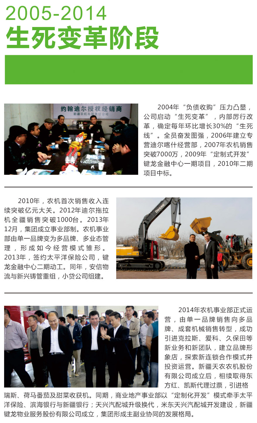 公司自2018年轉(zhuǎn)型升級(jí)以來(lái),逐步從傳統(tǒng)的農(nóng)機(jī)銷(xiāo)售服務(wù)向成套農(nóng)業(yè)機(jī)械化解決方案商轉(zhuǎn)型,通過(guò)5年的變革發(fā)展,2022年公司進(jìn)一步明確了戰(zhàn)略發(fā)展定位,打造“從耕種到收獲的全產(chǎn)業(yè)鏈綜合服務(wù)解決方案商”雙百億戰(zhàn)略的新目標(biāo)。